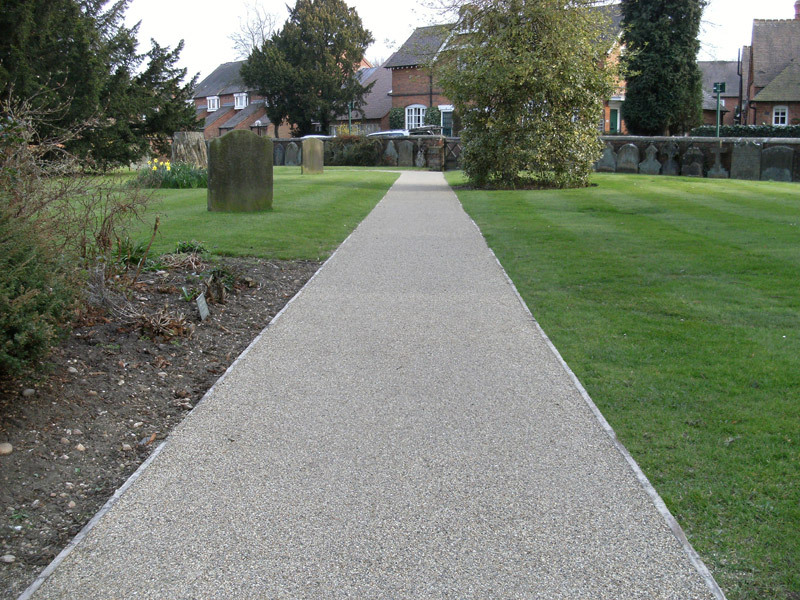 A refined churchyard entrance featuring resin bond surfacing, stonework and paving enhancements.