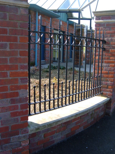 - Boundary walls with iron work railings with infilling between piers, entrance and side gates